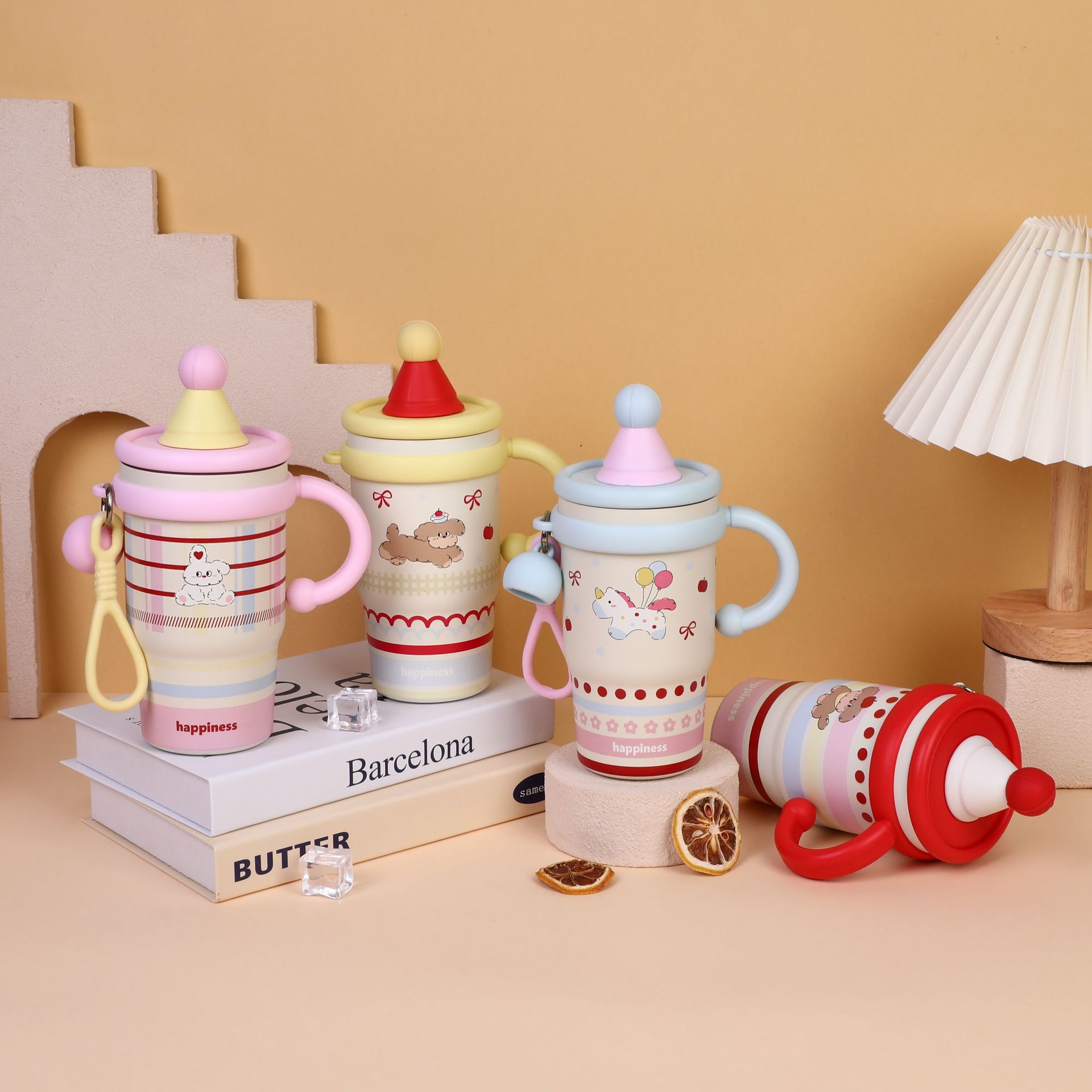 This mug features a cute unicorn design, a practical handle, and a charming hanging accessory. It has a lovely color scheme with elements like balloons, apples, and the word "happiness". Multiple styles are available for you to choose from.